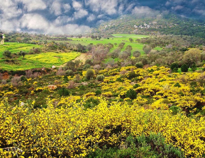 Tatlı bir meyille yükselen topografya, bir süre sonra güney yönünde bize Kara Urla’sına doğru uzanan geniş bir perspektif sundu. Aşağımızdaki düzlüğe doğru alçalan yamaçlar, sapsarı katırtırnakları, yeni çiçeğe durmuş karabaş otları ve sonbaharda açan çiçekleri üzerinde kurumuş halde yoğun piren kolonileri ile kaplıydı. Bu üçünün sarı, mor ve kahverengi renkleri birbirine karışınca ortaya çıkan, bir renk cümbüşüydü sanki.