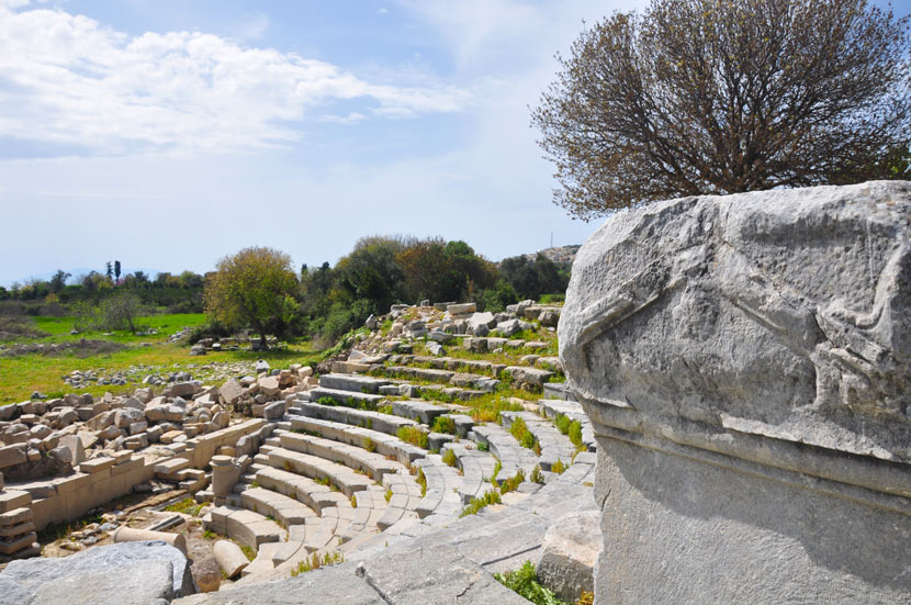 İşte, kuzeyde, ağzını çanak anten gibi açmış tiyatronun yeri. “Yeri” diyorum, çünkü oturma yerindeki mermerlerin çoğu, buraya gelirken gördüğümüz Sığacık Kalesi’nin yapımında kullanılmış. İlkçağın bayındır kentlerinin tiyatrosunda, her aileden birer kişinin oturmasına yetecek kadar mermer koltuk bulunurdu. Demek ki; kabataslak, o kentin nüfusu, tiyatro sığarının (kapasitesinin) dört ya da beş katı kadar olurdu.